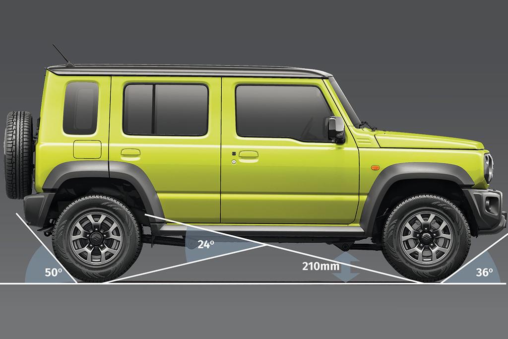 Khung gầm và khung thân xe Jimny vẫn tách biệt riêng (body-on-frame) để phục vụ mục đích off-road, tuy nhiên hệ thống treo được bổ sung thêm cơ cấu mới giúp tăng độ cứng vững xoắn. Cả góc tiếp cận (37 độ) và góc thoát (49 độ) đều tốt hơn trước.